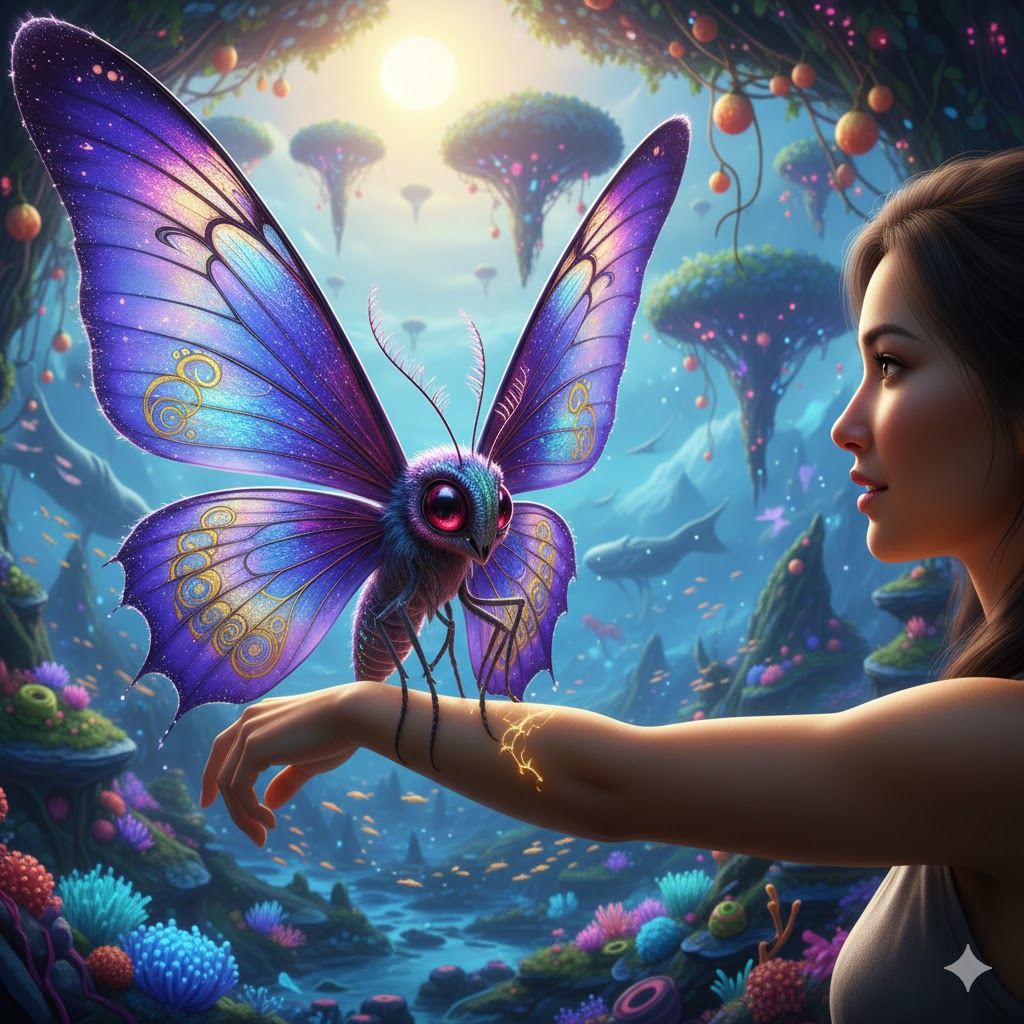 The butterfly's patterns shifted, and Zara felt a response—not in words, but in pure meaning that bypassed language entirely. It showed her visions of worlds she had never imagined: forests where trees sang in harmonies that could reshape matter, oceans where every drop of water held memories of civilizations long past, mountains that dreamed of stars.